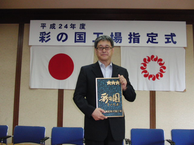 平成24年9月11日 彩の国指定工場に認定されました。 平成24年度の29工場を代表して上田県知事に謝辞を述べる機会をいただきました。